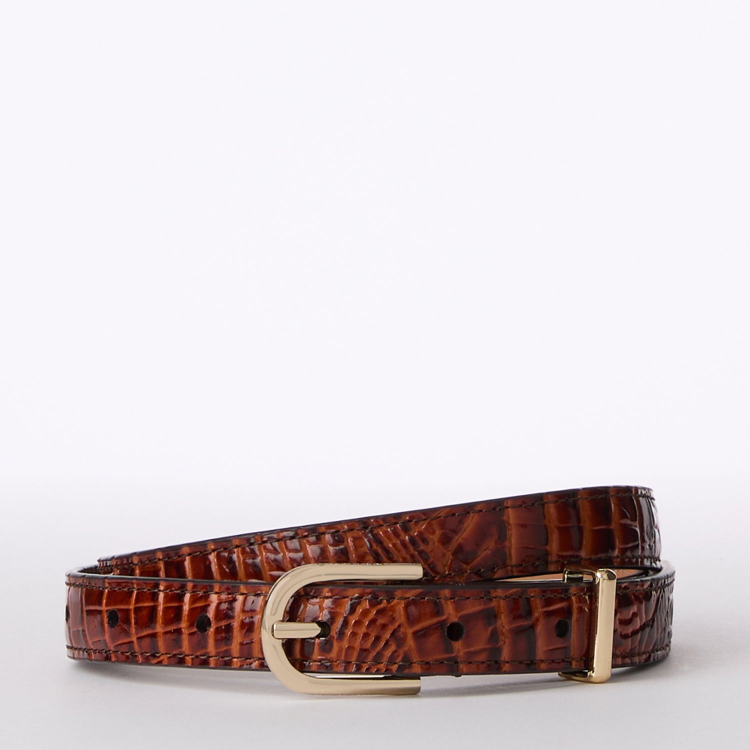 The Skinny Leather Gold Buckle Belt is designed to add an elevated accent to any ensemble. The thinner width belt brings just a hint of color to your look. The embossed logo design is a Brahmin signature. Made with genuine leather.