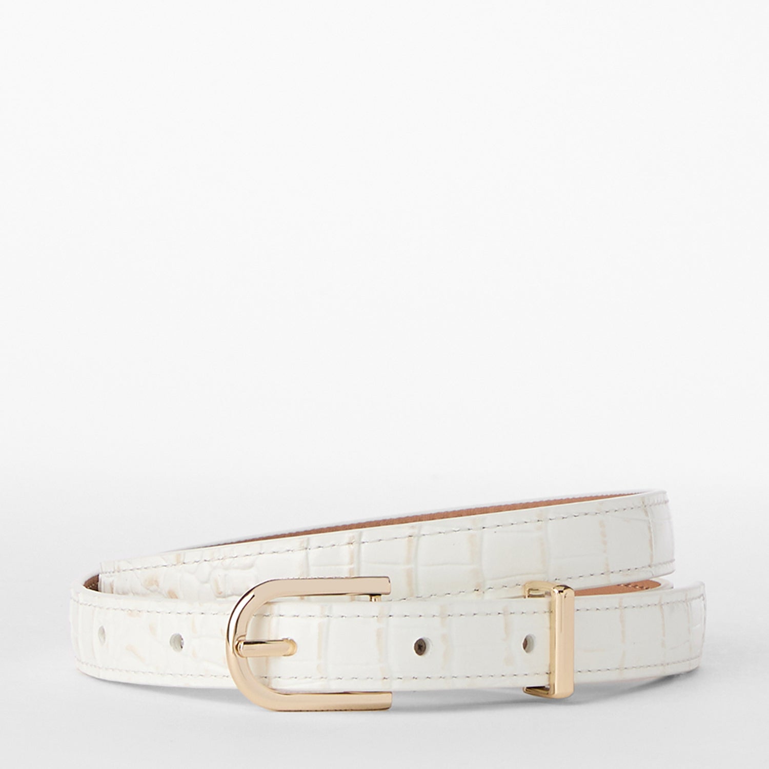 The Skinny Leather Gold Buckle Belt is designed to add an elevated accent to any ensemble. The thinner width belt brings just a hint of color to your look. The embossed logo design is a Brahmin signature. Made with genuine leather.